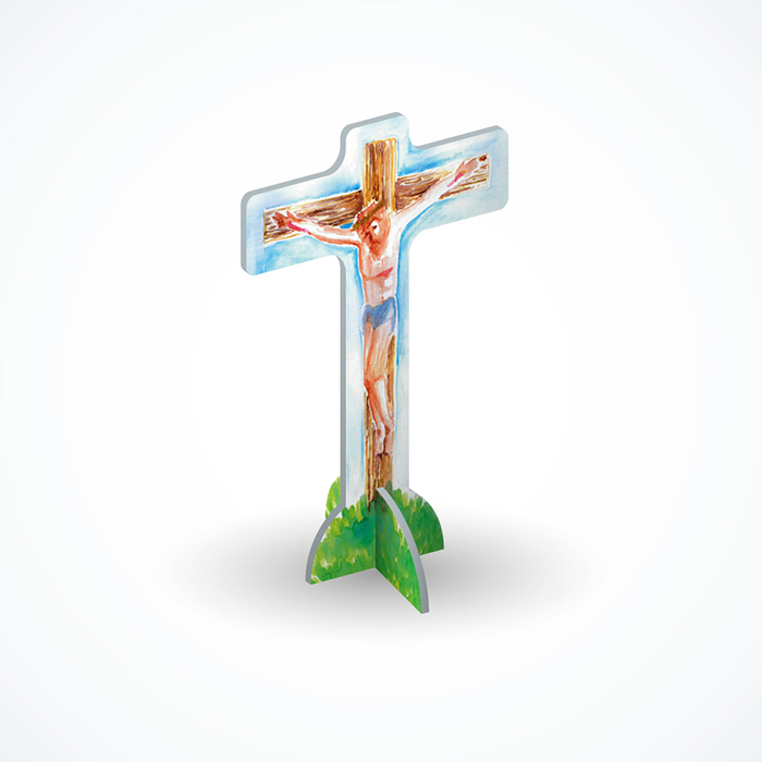 Educare alla meditazione e alla preghiera davanti all’immagine di Gesù crocifisso, per imparare a dedicare ogni giorno un po’ del nostro prezioso tempo al Signore. Croce in cartone con piedistallo.